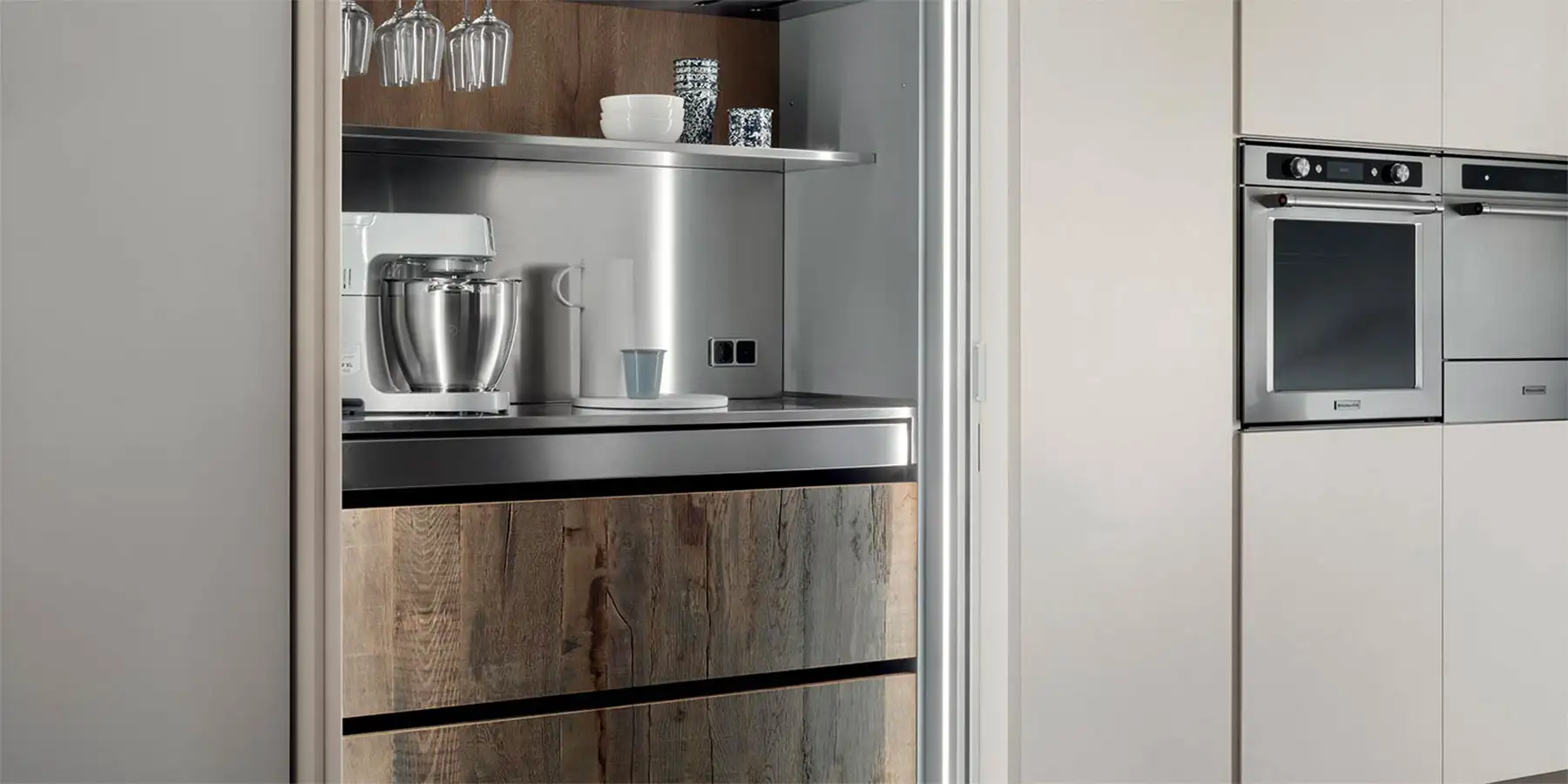 La scelta del suo nome deriva proprio dalla peculiare sagomatura a taglio di ante e top, in una linearità che si traduce in una continuità cromatica data dall’impiego per top, gole, ante e zoccoli di un’unica finitura.