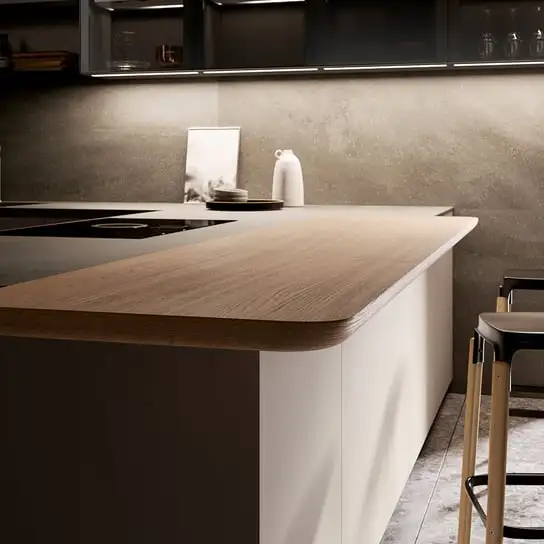L’armadio Indoor con ante rientranti disvela lo schienale attrezzato e il piano estraibile in acciaio. E per preziosi momenti di condivisione, ecco un’ampia varietà di snack a sbalzo sul piano di lavoro e di snack a ponte, che dal piano di lavoro si appoggiano sul lato opposto sopra le basi o contro una parete. Soluzioni flessibili e personalizzabili anche per la penisola snack, ad altezza tavolo con sostegni in metallo a terra o in appoggio sui top.