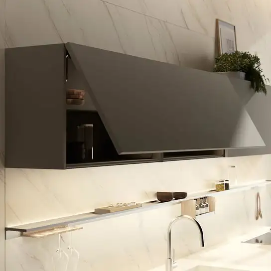 Le preziose venature del Rovere Imperial danno vita ad eleganti contrasti tra il calore del legno e le nuance dell’ambiente cucina. Il continuum volumetrico del pensile All-in-One ad anta unica con apertura vasistas, combina estetica ed efficienza impeccabili. All’interno sono comodamente inseriti elementi come lo scolapiatti, la cappa e i ripiani di contenimento. ONE. Ispirazioni di design di intensa e ricercata essenzialità stilistica.