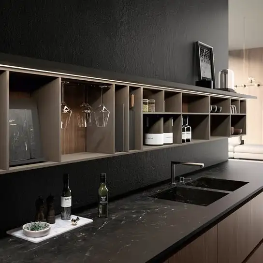 Laccati ed essenze, vetri e melamine high tech. Massima libertà d’espressione nella grande varietà di materiali e finiture esclusive. Le colonne ospitano sistemi per conservare in modo ottimale i cibi e per presentarli al meglio.