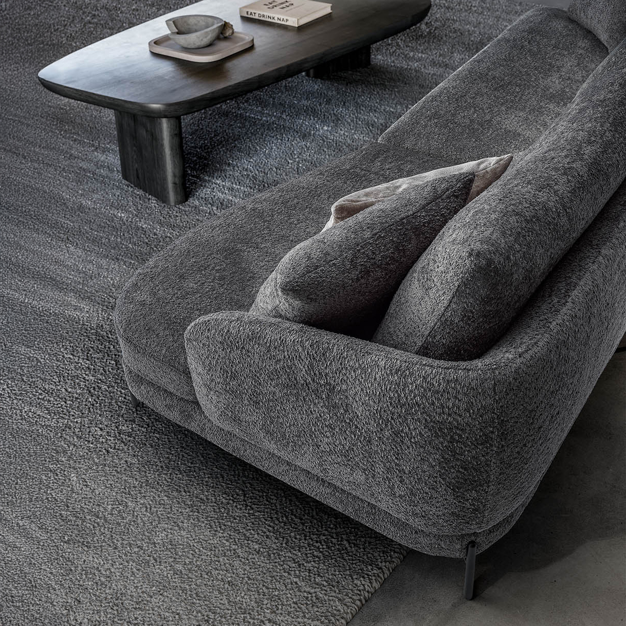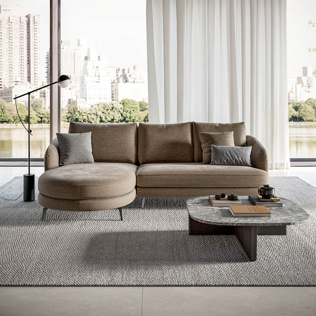 Le linee morbide della struttura disegnano volumi equilibrati e contemporanei, mentre il profilo slanciato dato dal design dei piedini alti in metallo alleggerisce lo spazio, trasformando il divano in un elemento architettonico elegante e adatto sia ai living moderni e che a quelli più classici.