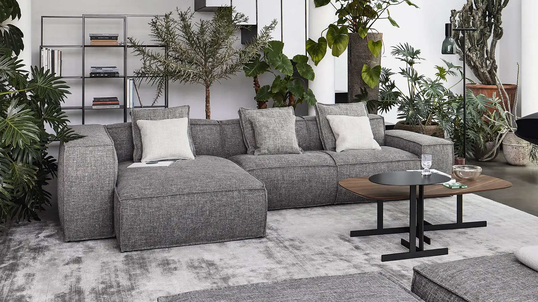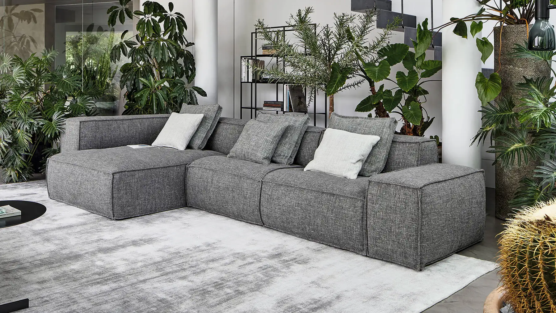 Le linee delle cuciture, che contornano i volumi morbidi delle sedute, si contrappongono alle forme più rigorose e geometriche della struttura con diverse profondità di seduta: il risultato è un divano in grado di adattarsi ad ogni esigenza di spazio e di stile.