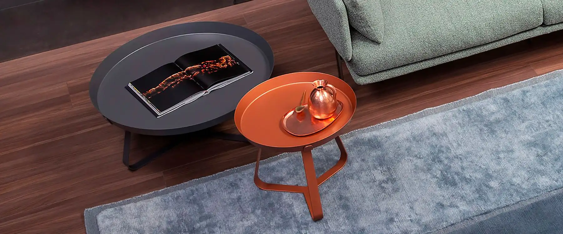 Il disegno geometrico della struttura dona loro leggerezza ed un gioco di equilibri tra angoli e arrotondamenti sorregge un vassoio estraibile. Il vassoio può essere in metallo nello stesso colore della base oppure, per creare un contrasto tra le finiture, impreziosito da un piano in ceramica. I tavolini Frinfri sono disponibili in tre diverse altezze.