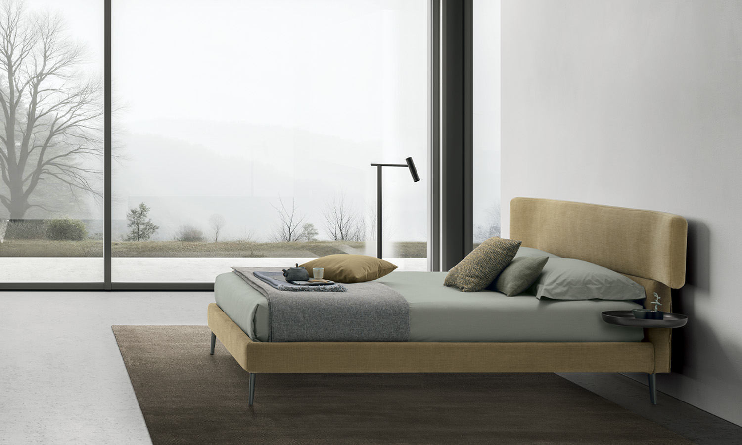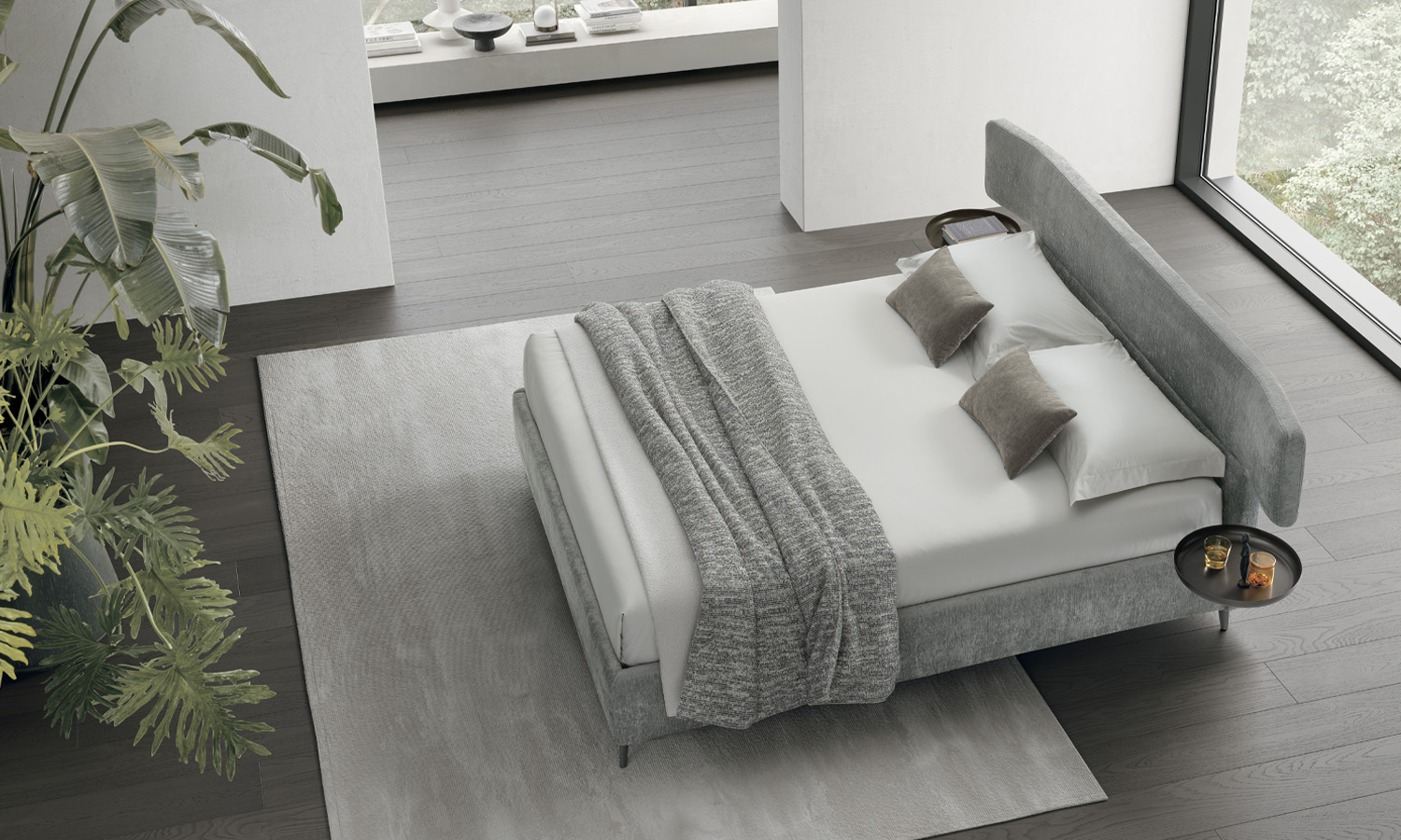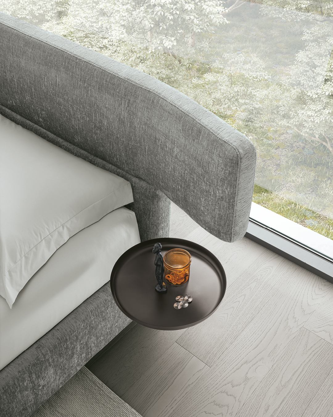 La testata curva leggermente verso l’interno, creando un abbraccio visivo e funzionale. Una forma pensata per aumentare la sensazione di comfort e accogliere con naturalezza gli elementi d’arredo integrati. I due tavolini tondi in metallo, integrati nella testata, sono un’alternativa salvaspazio ai comodini tradizionali. Leggeri e discreti, aggiungono personalità senza rinunciare alla praticità.