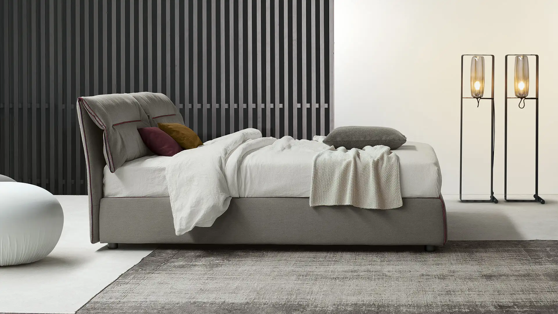 Il letto Campo, disponibile nella versione matrimoniale o singola, si contraddistingue per la morbida testata imbottita che asseconda comodamente le posizioni del corpo.