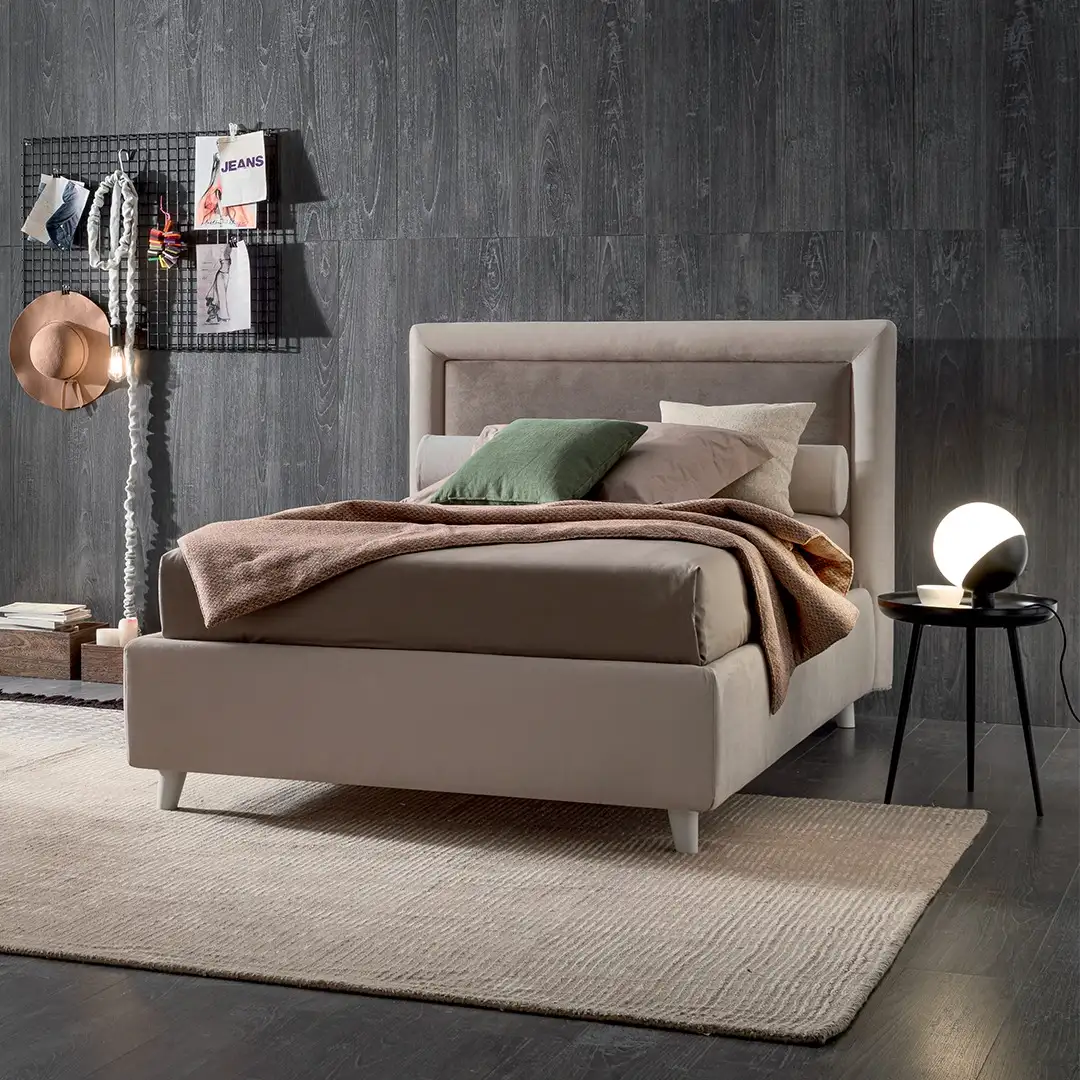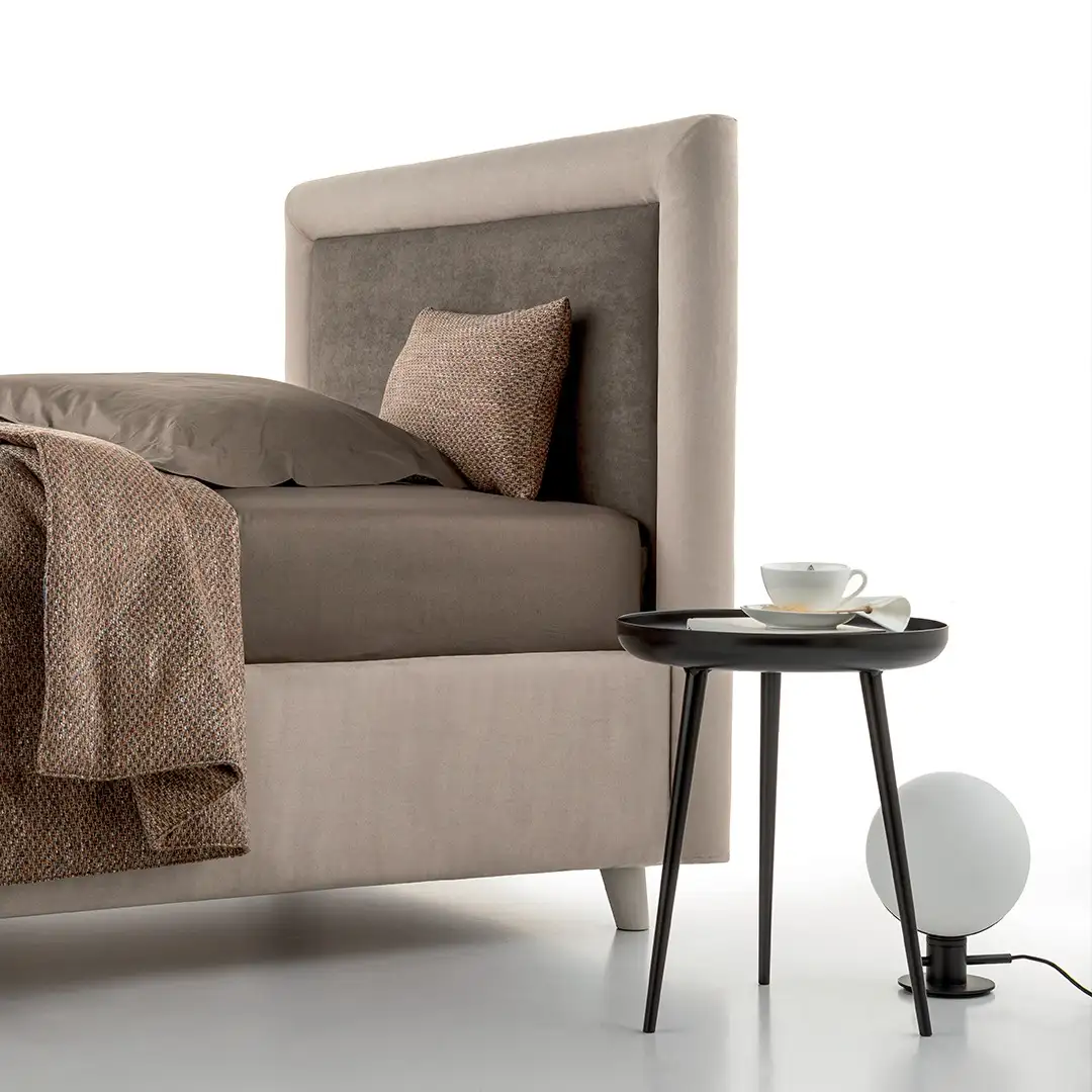 La testata del letto è caratterizzata da un bordo imbottito e arrotondato che incornicia la testata e mette in risalto la doppia finitura.