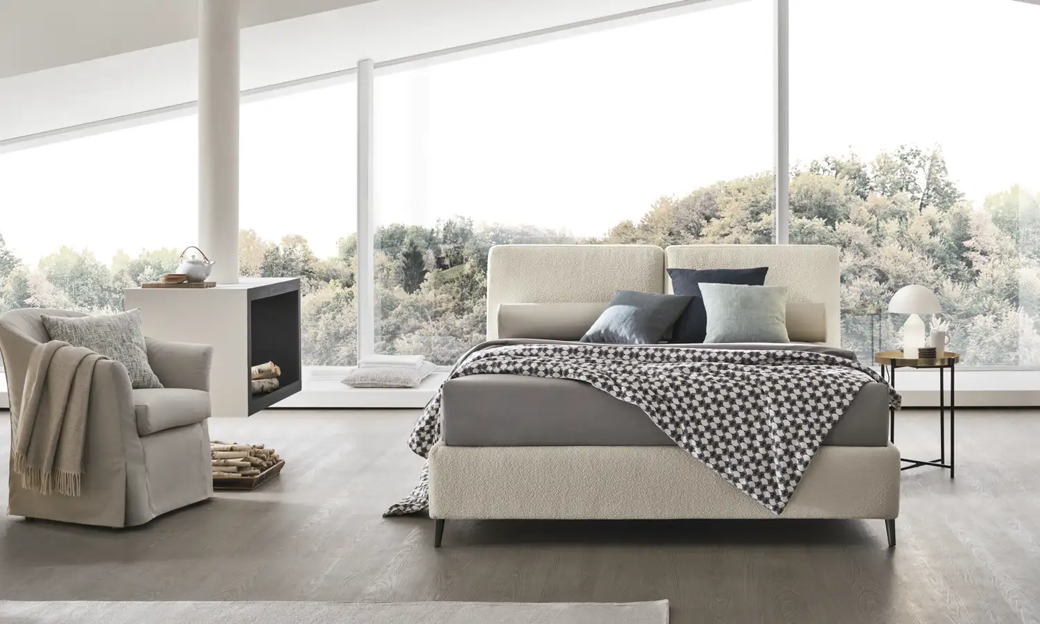 La pedana in alluminio bronzo fumé contribuisce a creare un look di ispirazione retrò. Un letto matrimoniale di tendenza, che strizza l’occhio alle mode del passato e le trasporta nel presente. La testata può essere rivestita con doppia finitura, ma anche con un unico tessuto. Per creare il look perfetto alla tua camera da letto!