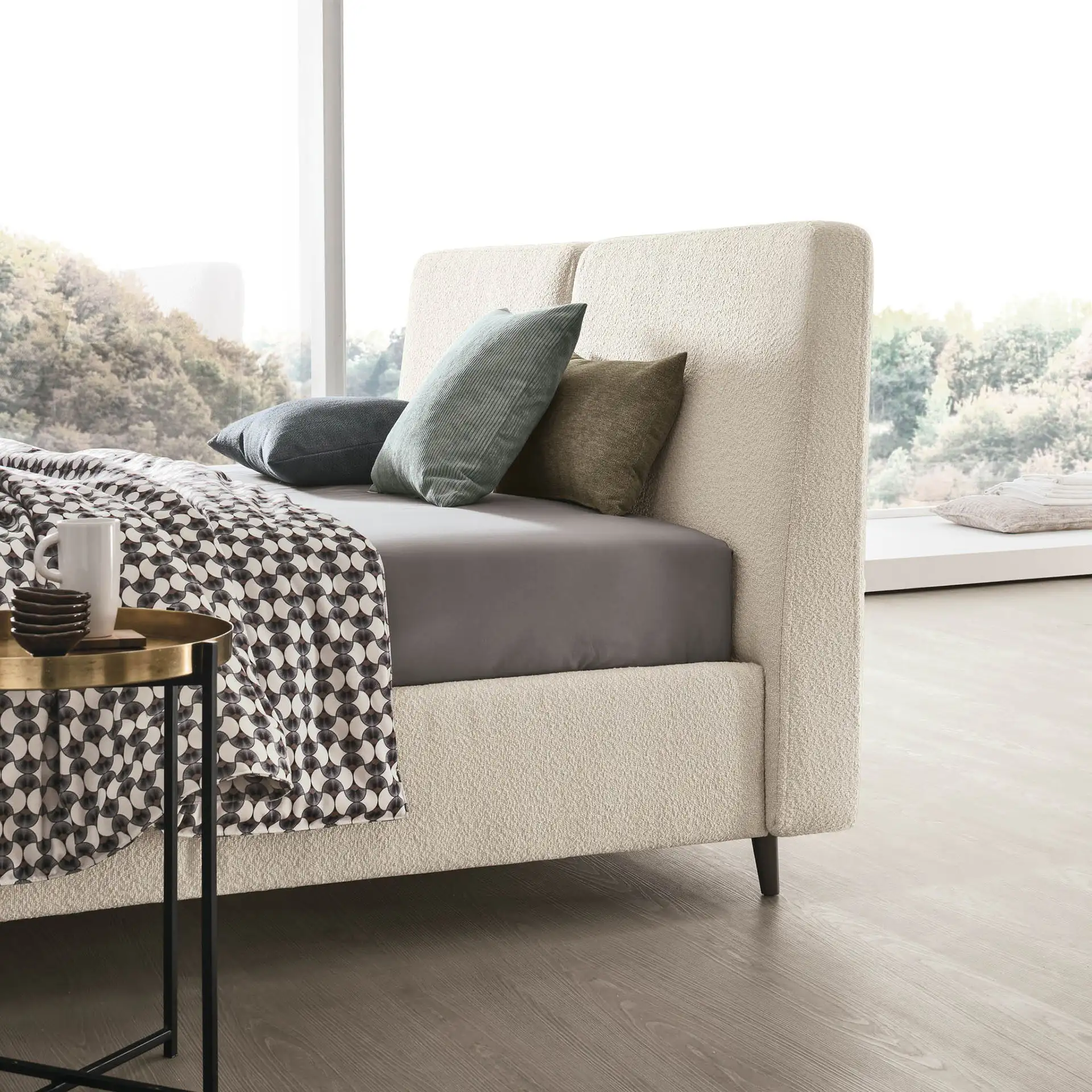 A ciascuno il suo punto d’appoggio. Un letto matrimoniale con testata composta da due cuscini imbottiti distinti, rivestiti con texture diverse e materiali di tendenza del mondo fashion, per personalizzarne lo stile.