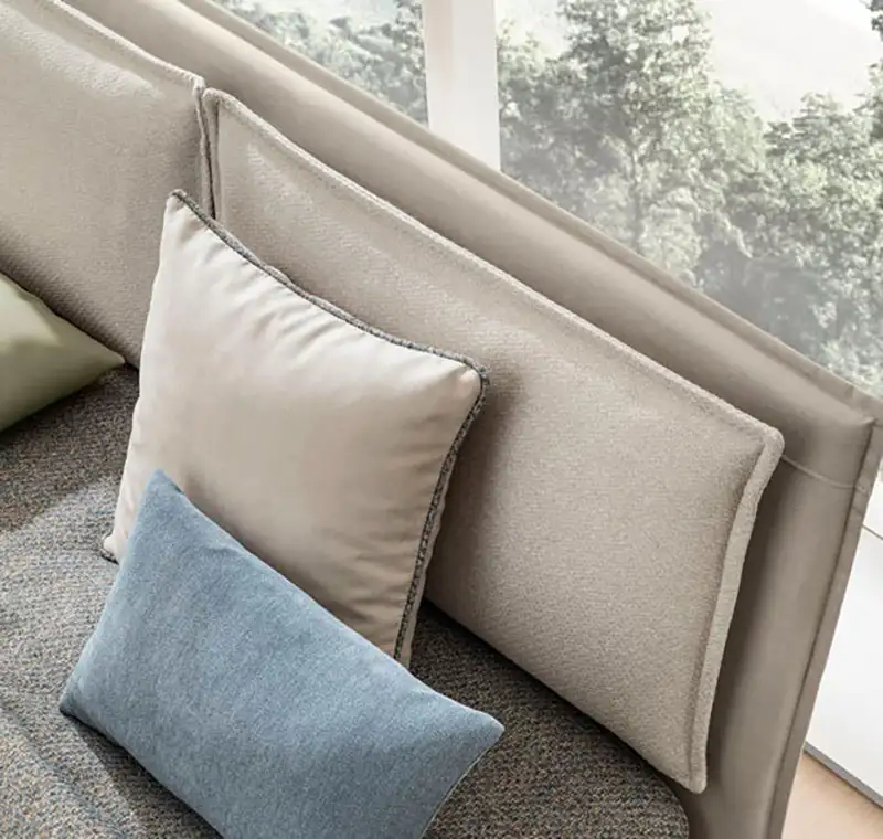 La testata di Wiki è leggermente incurvata e ha due cuscini applicabili e personalizzabili, in tinta con il rivestimento per un look tono su tono, oppure a contrasto per creare abbinamenti originali.