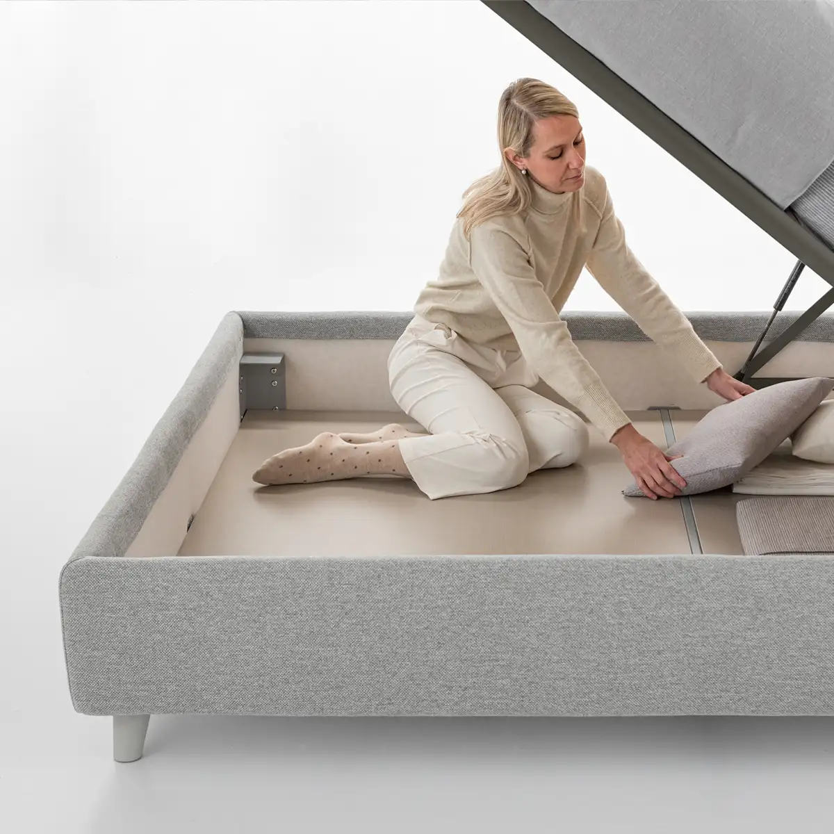 Doppi cuscini e testata leggermente incurvata. Un modello ideale per chi ama abbandonarsi nelle braccia di un letto morbido e accogliente, senza riunciare allo stile, grazie ad abbinamenti tono su tono o a contrasto. Disponibile nella versione matrimoniale o una piazza e mezza e con giroletto di 14 cm oppure 25, che consente di inserire un pratico box contenitore.