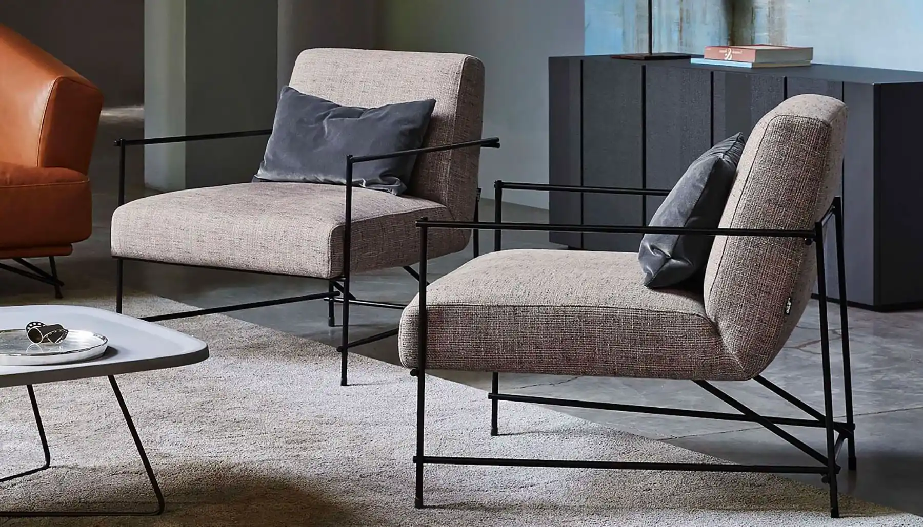 Seduta e schienale praticamente sospesi, sorretti da una sottile struttura in metallo finitura nero. Un oggetto in grado di imprimere unicità all’ambiente di arredo, sia esso il living di casa o uno spazio pubblico. Molti i rivestimenti a catalogo.