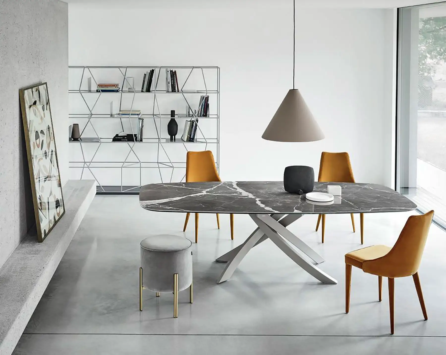 Tavolo fisso e allungabile con struttura in Acciaio laccato. Piano in Legno massello, Legno massello secolare, Legno massellato, Legno impiallacciato, Legno laccato, Cristallo, Cristallo Antigraffio, SuperCeramica, SuperMarmo e Marmo naturale.