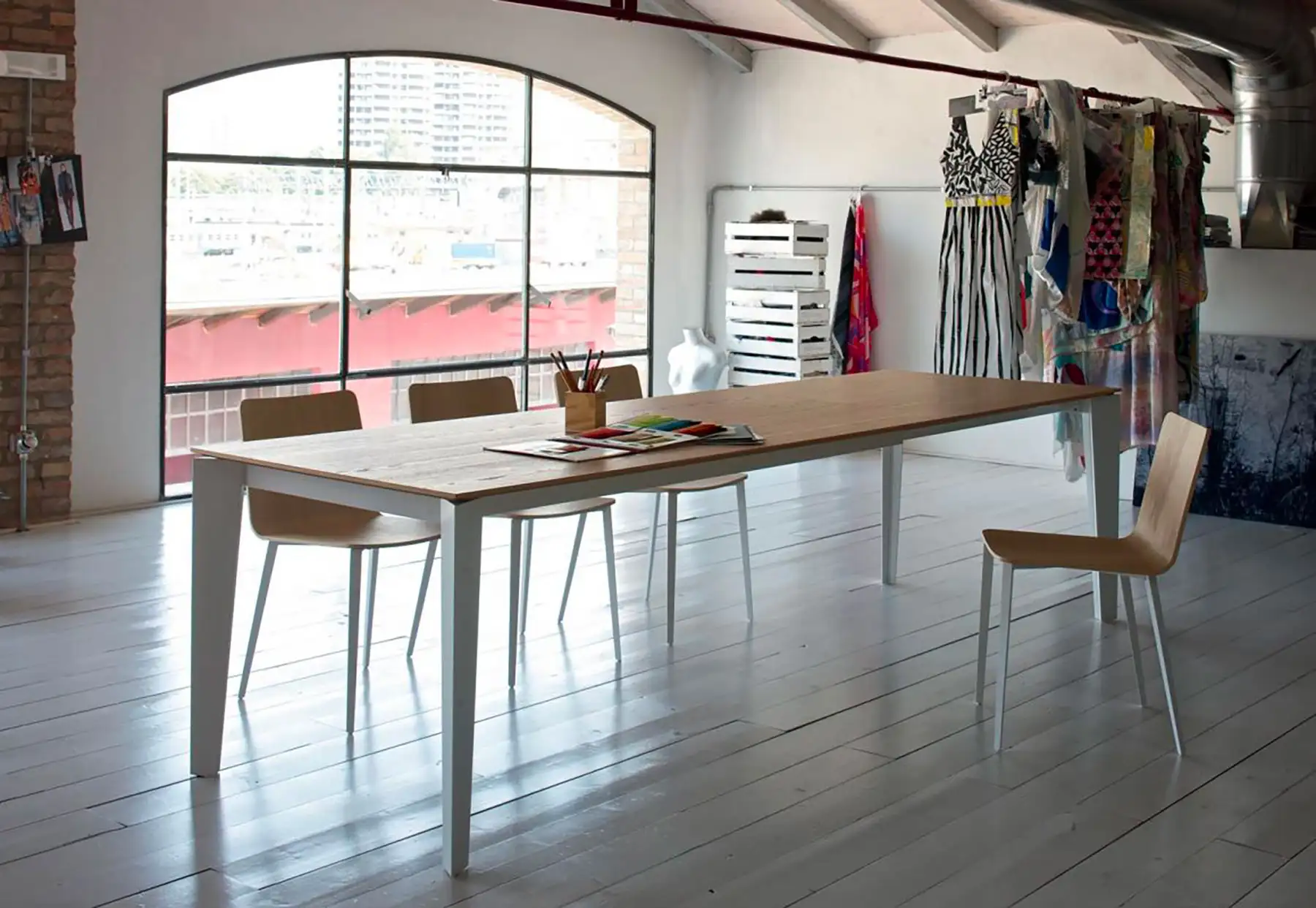 Tavolo allungabile con struttura in acciaio (disponibili vari colori). Piano in melaminico, laminato Fenix, Unicolor Antigraffio, Legno impiallacciato, Cristallo, Cristallo Antigraffio, SuperCeramica e SuperMarmo.